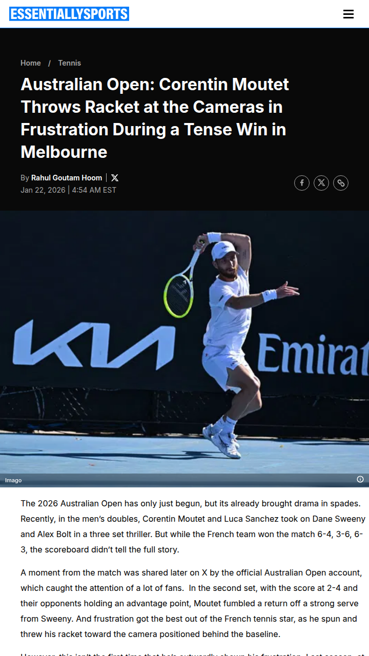 tammy84+FollowMoutet’s Racket Rage at the Aussie OpenDid anyone catch Corentin Moutet’s wild moment in the men’s doubles at the Australian Open? The Frenchman totally lost his cool after a tough point against Sweeny and Bolt, spinning and launching his racket right at the baseline camera! Even though Moutet and Sanchez pulled off the win, that outburst is all anyone’s talking about. Was it passion or over the line? Let’s hear your takes, tennis fam! #Sports #Tennis #AustralianOpen00Share