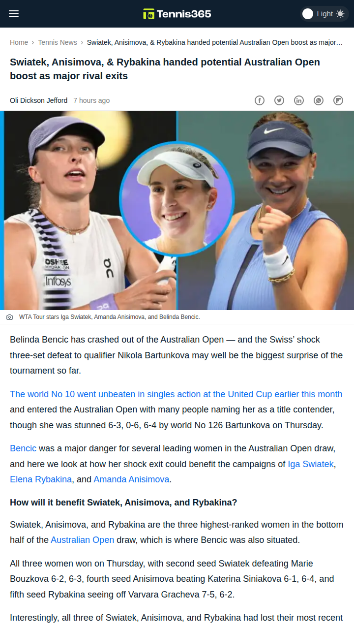 Stephen Herrera+FollowBencic’s Exit Shakes Up Aussie Open DrawHuge shock at the Australian Open as Belinda Bencic bows out early to qualifier Bartunkova! With the Swiss star gone, the bottom half of the draw just got a lot more interesting for Iga “Queen of Clay” Swiatek, Amanda Anisimova, and Elena Rybakina. All three had recent losses to Bencic, so her exit could be the break they needed. Does this clear the path for Rybakina to make a deep run? Let’s hear your predictions! #Sports #Tennis #AustralianOpen00Share