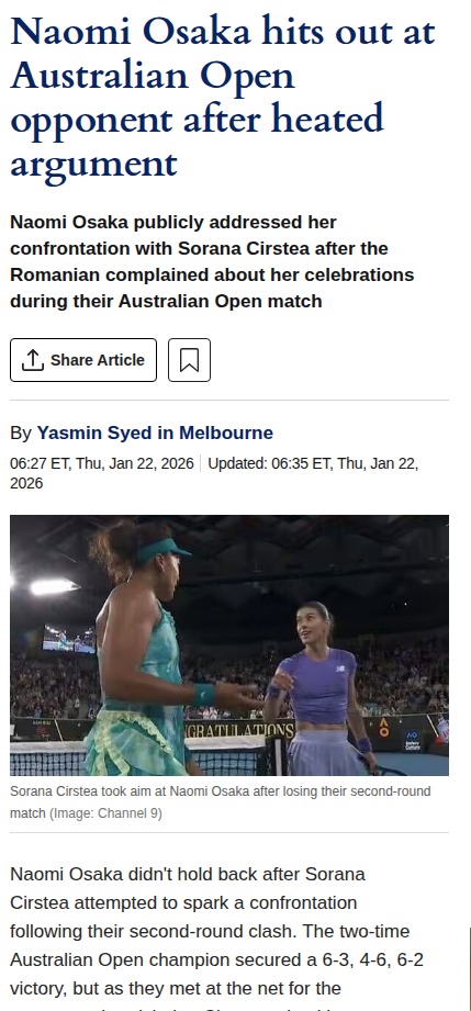 Nicholas Henderson+FollowOsaka vs Cirstea: Frosty Handshake DramaWow, did anyone catch the tension between Queen Naomi and Cirstea at the Aussie Open? Osaka took the win, but the real drama was that icy handshake and Cirstea’s words at the net. Apparently, Cirstea was heated over Osaka’s “come-ons” between points. Osaka seemed genuinely confused and even apologized later. Classic case of emotions running high in a big tournament. Thoughts on whether Osaka crossed a line or just standard gamesmanship? #Sports #Tennis #AustralianOpen00Share