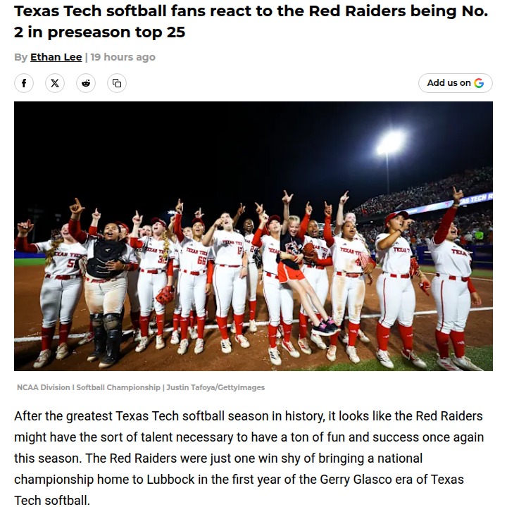 Eddie Deleon+FollowRed Raiders ranked No. 2—can they go all the way?Texas Tech softball is starting the season with sky-high expectations, landing at No. 2 in the national preseason rankings. After coming so close to a championship last year, fans in Lubbock are buzzing about another shot at the title. There’s a mix of excitement and a bit of disbelief—some think the Red Raiders deserve the top spot, while others are just happy to see them getting national respect. With tough rivals like Texas and Oklahoma nearby, the competition will be fierce. What do you think—can Tech finish what they started? #Sports #TexasTech #RedRaiders00Share