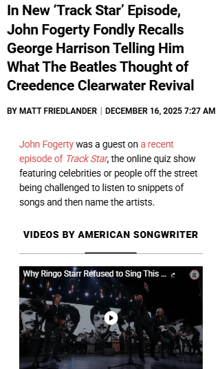 sfrazier+FollowGeorge Harrison’s CCR Confession 😲John Fogerty just spilled on Track Star: George Harrison once told him The Beatles were actually big Creedence Clearwater Revival fans! Total plot twist—fans always debate which bands the Fab Four respected, and now we know CCR made the cut. Fogerty said he’s carried that compliment with him ever since. Imagine being told by a Beatle your band was loved by THE band. Instant legend status! #Entertainment #Music #TheBeatles00Share