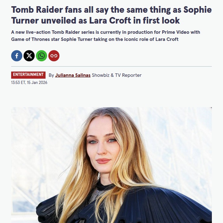 norma13+FollowSophie Turner as Lara Croft: Hit or Miss?Amazon’s new Tomb Raider series just dropped its cast list, with Sophie Turner stepping into Lara Croft’s iconic boots. With Phoebe Waller-Bridge at the helm and a mix of canon and fresh characters, is this the reboot that finally nails the balance between nostalgia and innovation? Or is it another example of studios playing it safe with familiar faces? Let’s debate: does this casting move excite or worry you? #Games #VideoGames #TombRaider95Share