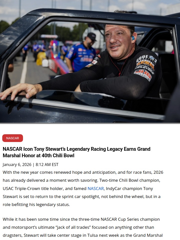 qglover+FollowTony Stewart honored at Tulsa’s Chili BowlTony Stewart, a true racing legend, is stepping into the spotlight at Tulsa’s 40th Chili Bowl Nationals—not as a driver, but as Grand Marshal. Stewart’s impact on dirt-track racing and the Chili Bowl is massive; he’s not just a two-time winner but also a key figure in making the event what it is today. For longtime fans, seeing Stewart honored this way feels like a full-circle moment. What do you think—does Stewart’s legacy deserve even more recognition in the racing world? #Sports #Racing #TonyStewart10Share