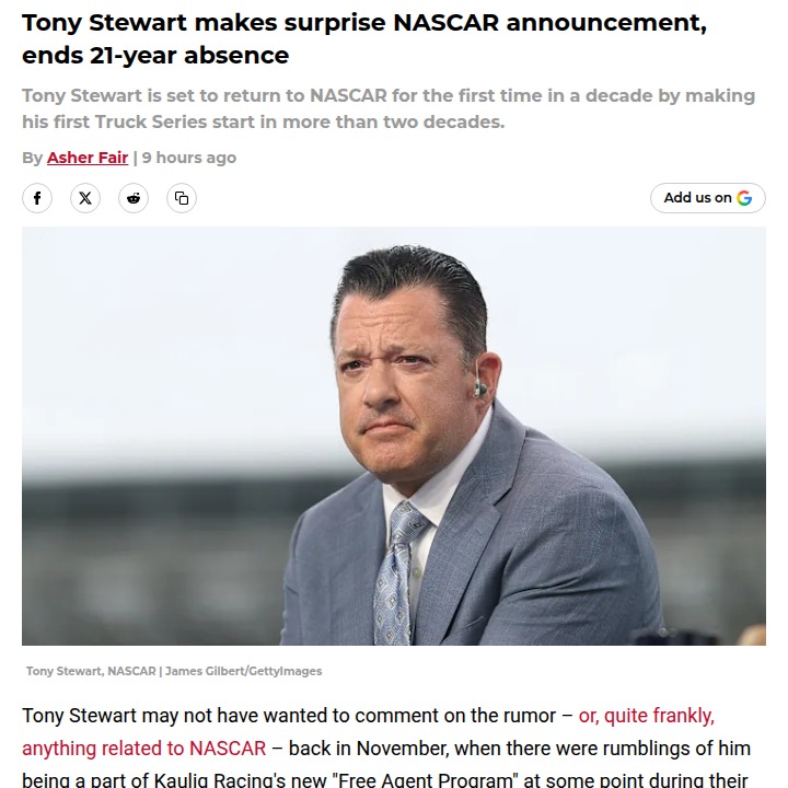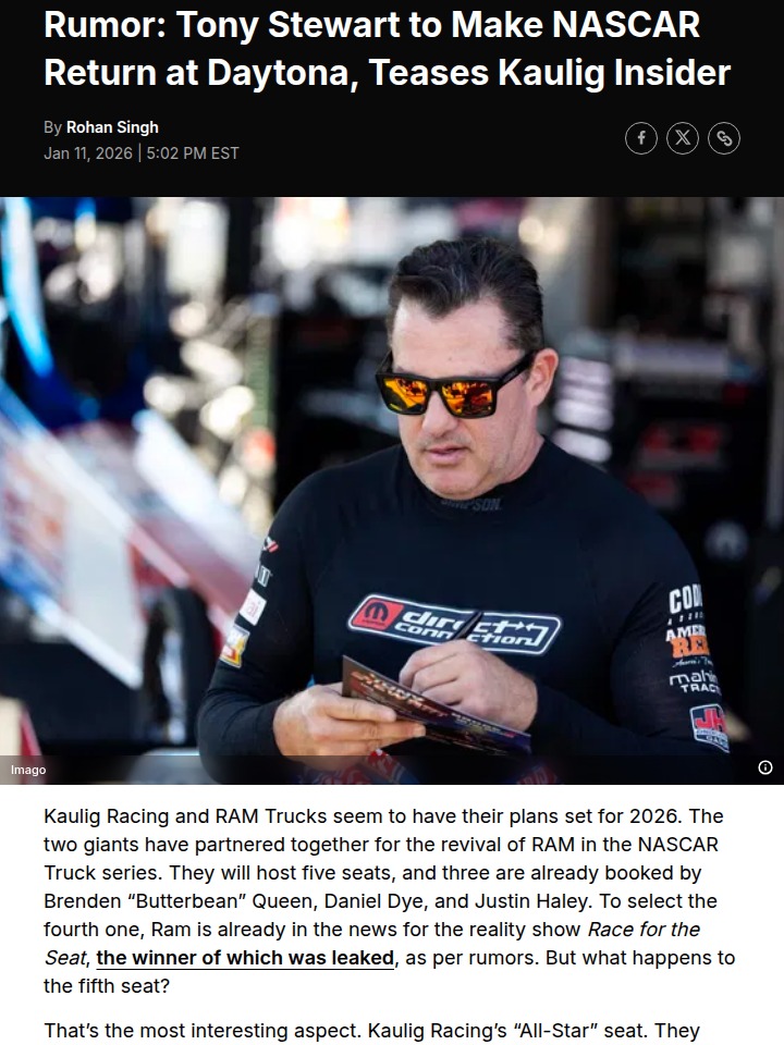 Roger Franco+FollowIs Smoke Back? Tony Stewart’s Daytona BuzzNASCAR fans, could we really see “Smoke” burning rubber at Daytona again? Kaulig Racing’s new All-Star seat for the 2026 Truck Series has everyone talking, especially after a cryptic GIF hint from a team insider. With Tony Stewart’s legendary status and past drama with NASCAR, his rumored return would be a massive fan moment. Nothing’s official yet, but the hype is real—will Kaulig and NASCAR deliver? #Sports #Racing #TonyStewart110Share