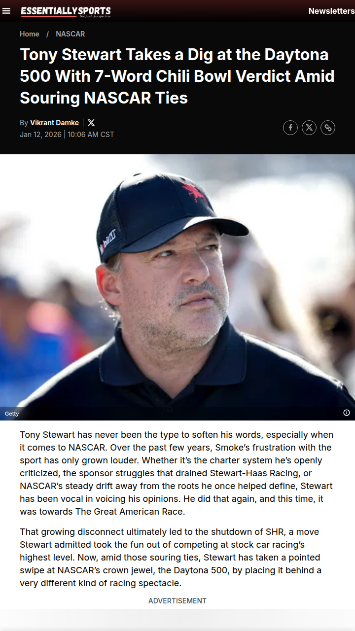 Jeremy Campbell+FollowTony Stewart: Chili Bowl Over Daytona?Smoke is stirring the pot again! Tony Stewart just dropped a bombshell, saying the Chili Bowl Midget Nationals means more to him than the Daytona 500. He’s never been shy about calling out NASCAR, but this time he’s really fanning the rivalry between dirt and stock car fans. With over 400 drivers at the Chili Bowl and only 40 at Daytona, Stewart says the challenge is just on another level. What do you think—has the Daytona 500 lost its crown? #Sports #Racing #TonyStewart00Share