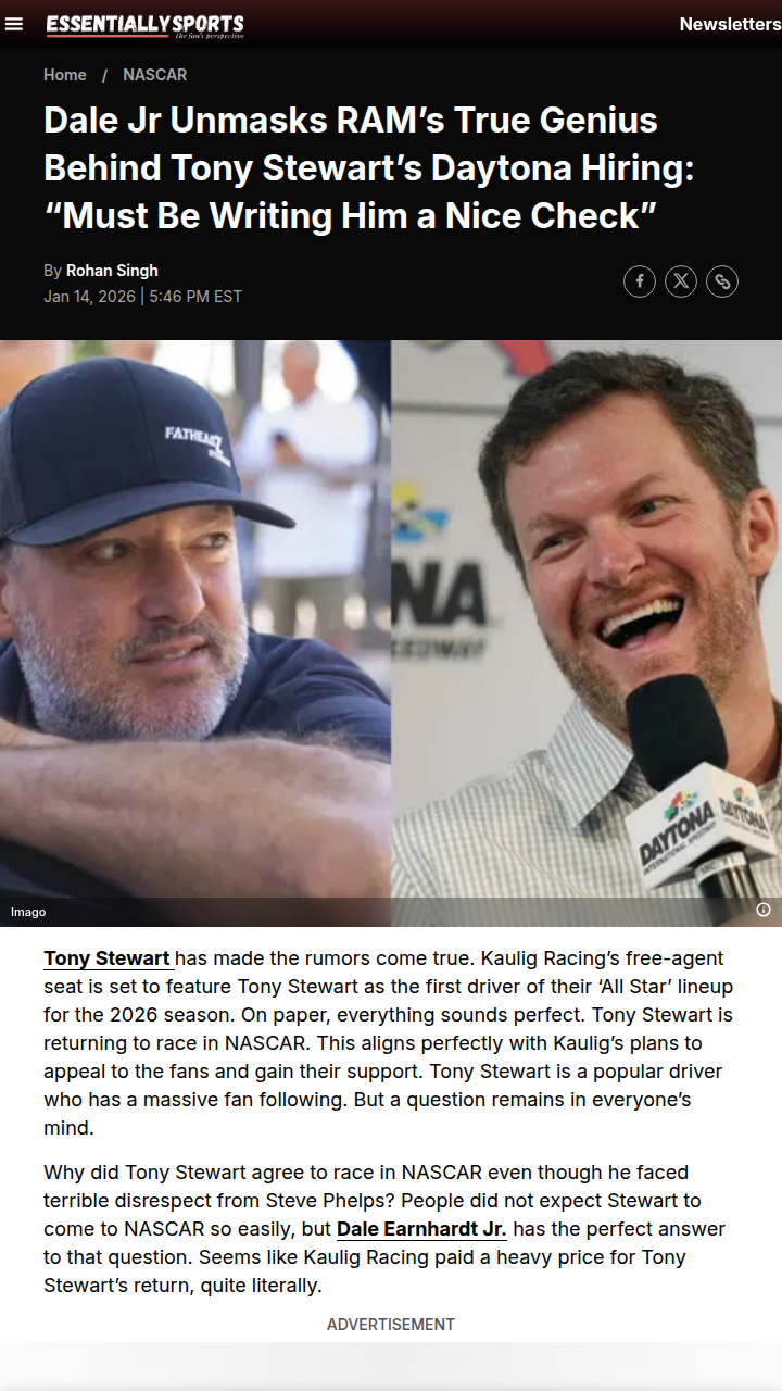 Isabel Collier+FollowSmoke and Mirrors: Tony Stewart’s Big Daytona ReturnSmoke’s back at Daytona, but not without some drama! Dale Jr. just dropped on his podcast that Kaulig Racing and Ram Trucks must’ve offered Tony Stewart a monster check to get him back in NASCAR, especially after all the beef with Steve Phelps. With Dodge trying to make a splash and fans hungry for legends, this move could be a game-changer. Do you think the money or the legacy brought Smoke back? Let’s hear your takes! #Sports #Racing #TonyStewart10Share