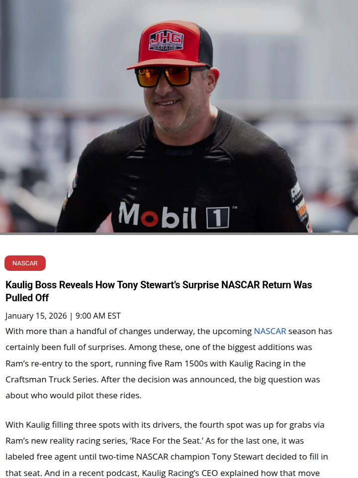 jennifer23+FollowSmoke Returns: Tony Stewart Joins KauligDid anyone see this coming? 'Smoke' Tony Stewart is back in NASCAR Trucks, piloting a Ram 1500 for Kaulig Racing at Daytona! Kaulig’s boss Chris Rice spilled the details on SiriusXM, revealing how Stewart’s ties with Ram’s parent company and some last-minute convincing sealed the deal. Stewart’s return, after nearly two decades away from Trucks, is a huge boost for both Kaulig and Ram’s comeback. Can’t wait to see how this shakes up the field! #Sports #Racing #TonyStewart20Share