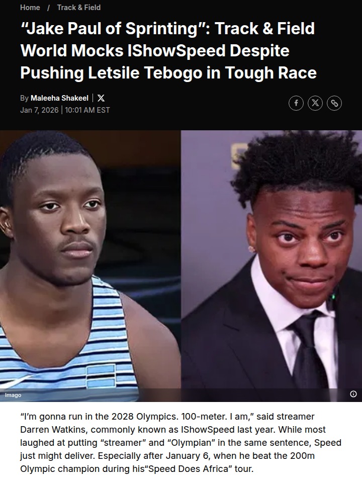 jharvey+FollowIs iShowSpeed the Jake Paul of Sprinting?Speed Nation, what do we make of iShowSpeed’s wild sprint win over Tebogo? The man’s got a killer start and showmanship for days, but the track world isn’t buying it—calling him the Jake Paul of sprinting. Fans are split: some love the viral races, others want to see Speed run a legit 100m and prove he’s more than just hype. Would you pay to see him race a real pro? #Sports #iShowSpeed #TrackAndField00Share