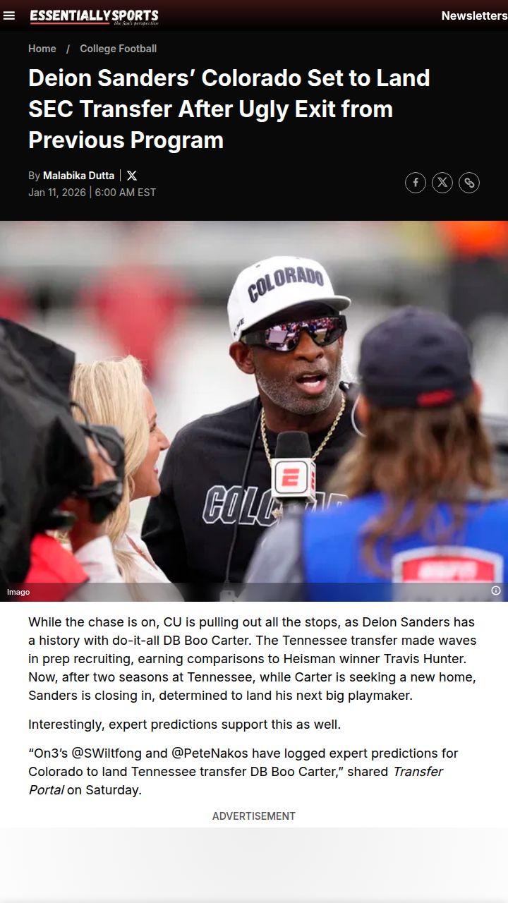 glen25+FollowBuffs vs Tigers: Boo Carter Transfer DramaPrime Time is at it again! Deion Sanders is making a hard push to land Boo Carter, the ex-Vols DB who’s drawn Travis Hunter comparisons. After a messy Tennessee exit, Carter’s down to Colorado and Auburn—two programs with deep ties to his story. The Buffs’ need is real, but Auburn’s staff knows Carter well. If Coach Prime pulls this off, it’s a major win for Boulder. Can the Buffs out-recruit the Tigers for this top-60 portal talent? #Sports #Football #TransferPortal00Share