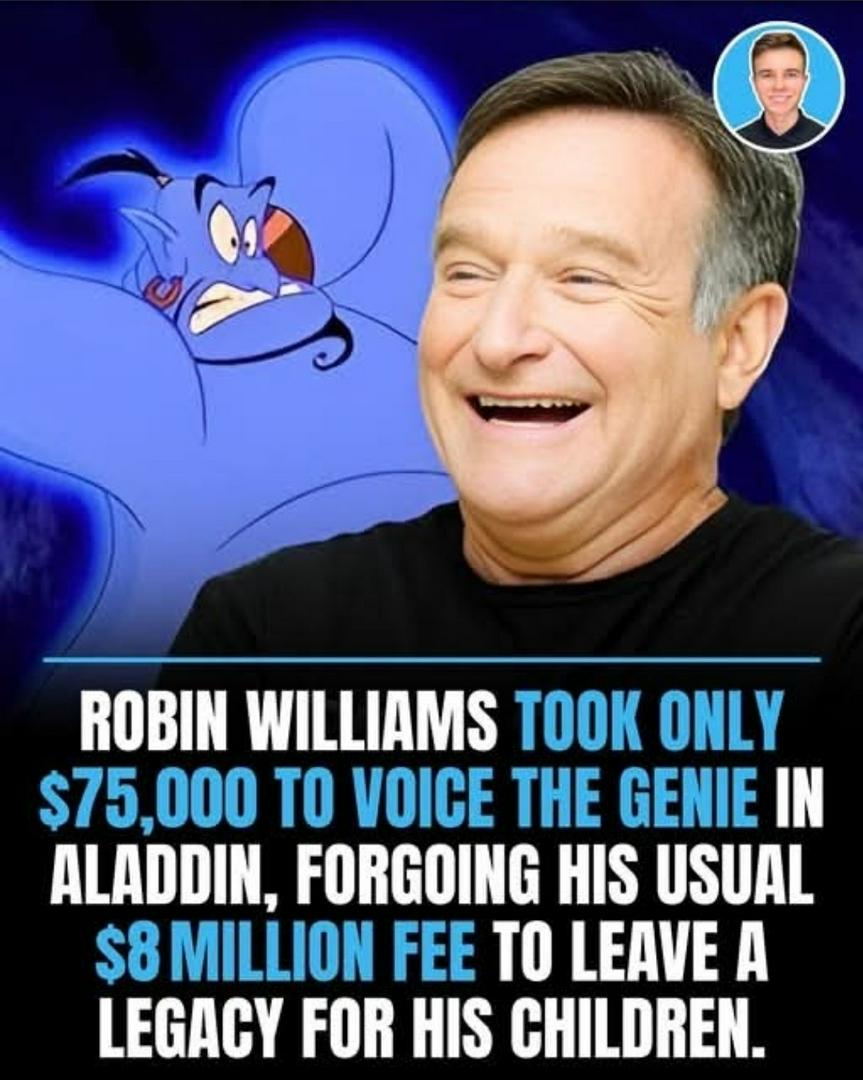 Robblyn+FollowRobin Williams agreed to be paid only $75,000 to voice the Genie in Disnev's 1992 Aladdin, a huge drop from his typical $8 million fee. His reason? He wanted to create something meaningful for his children and for generations to come. His performance gave the character a unique charm, making the Genie one of animation's most beloved fiqures. #RobinWilliams #Viral #ViralPost #ViralMoment #Trending #TrendingNow60Share