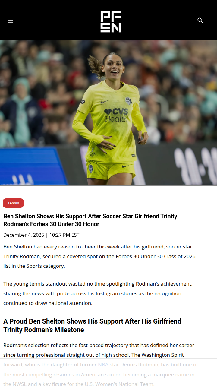Dawn Fritz+FollowRodman Joins Forbes 30U30—Shelton Reacts!Huge congrats to Trinity Rodman, aka the Spirit’s rising star, for landing on Forbes’ 30 Under 30! King Ben Shelton was quick to hype her up on IG, showing some serious couple goals. Rodman’s been breaking records since her NWSL debut, and this latest honor just cements her as one of the game’s brightest young talents. What do you think sets Rodman apart from other young USWNT stars? #Sports #TrinityRodman #Forbes30Under3000Share