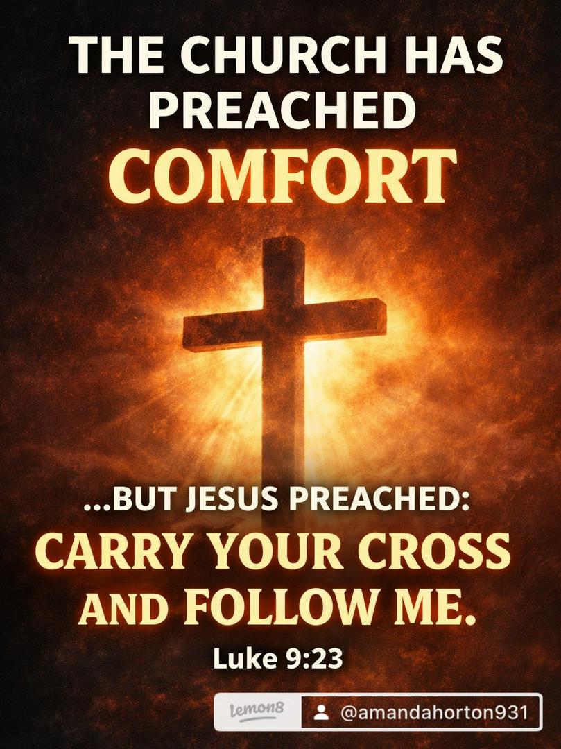 Christ Follower+FollowThe church taught comfort. Jesus said: carry your cross. We weren’t called to cruise through life we were called to die to self. This is the line between fans and followers. (Luke 9:23) #TruthOverDeception #EndOfTheAgeChurch #CrossOverComfort #WakeUpCall #RemnantRising 676Share