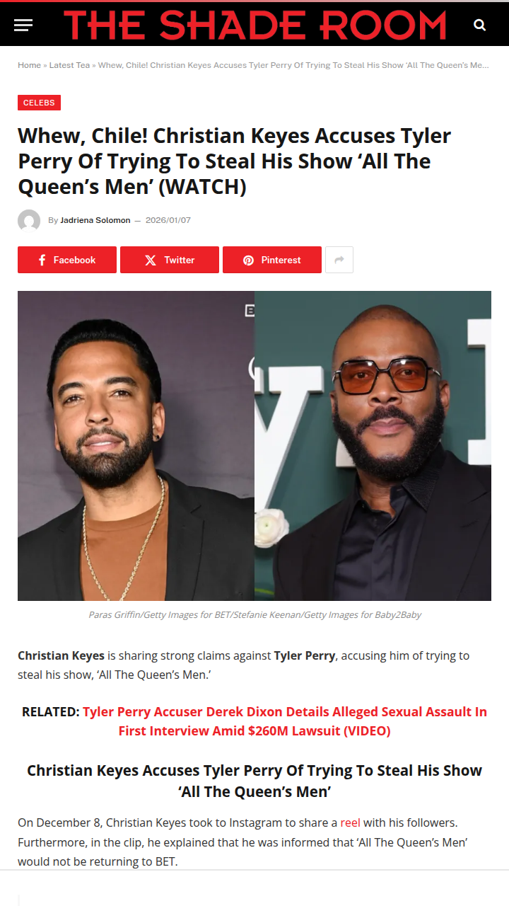 julie72+FollowTyler Perry vs. Christian Keyes?! 👀Did anyone else catch Christian Keyes calling out Tyler Perry for allegedly trying to steal ‘All The Queen’s Men’? Keyes claims Perry tried to take credit and even made the show “weird” with his input. Fans are split—some say they noticed the vibe shift, others are defending Perry. With more lawsuits and drama swirling, is this the end for ATQM on BET or just the start of a new chapter? #Entertainment #Celebrity #TylerPerry82Share