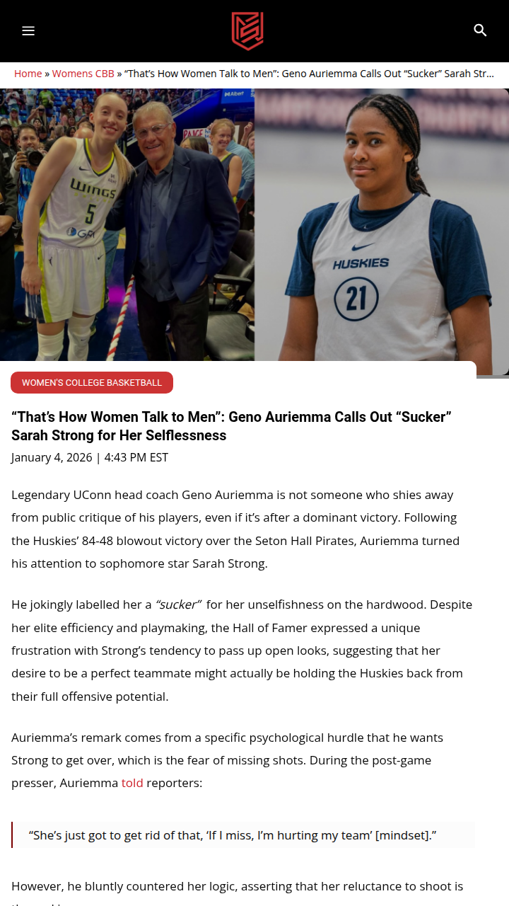 Aaron Gentry+FollowGeno Auriemma’s tough love for Sarah StrongGeno Auriemma isn’t holding back—he wants Sarah Strong to stop being so selfless and start taking over games for UConn. After a huge win, he called her a “sucker” for passing up shots, saying her desire to be the perfect teammate is actually slowing the Huskies down. With Strong’s insane efficiency and all-around stats, Auriemma believes she could be unstoppable if she played more aggressively. He’s pushing her to ditch the fear of missing and embrace a killer instinct. Do you think this tough love approach will unlock another level for UConn’s offense? #Sports #UConn #SarahStrong00Share