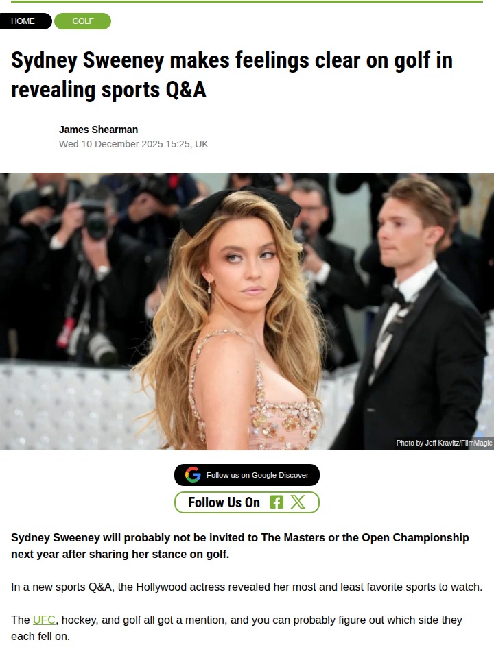 Bruce Johnson+FollowSweeney Picks UFC Over Golf—Fight Club Vibes!Sydney Sweeney just made it clear: she’s got more Dana White than Tiger Woods in her. In a rapid-fire Q&A, Sweeney called out UFC and hockey as her top sports to watch, while golf got the cold shoulder. Her pick to go pro? “Throw me in a ring!” With rumors swirling about a Happy Gilmore 2 cameo, her anti-golf stance is pure comedy. Anyone else loving her fight-club energy over country-club calm? #Sports #SydneySweeney #UFC00Share