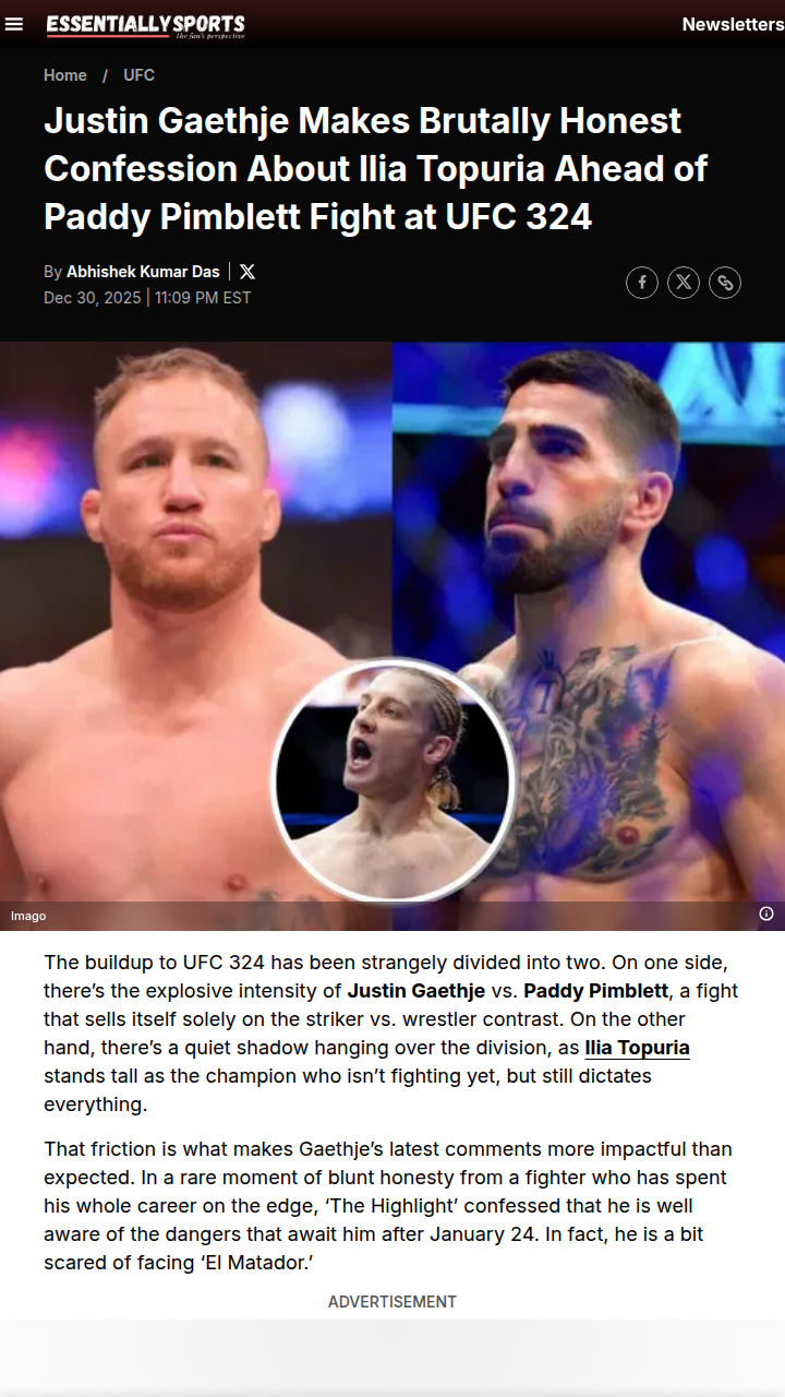 Diamond Horton+FollowGaethje Admits Topuria Fear Before UFC 324Did anyone else catch 'The Highlight' getting real about Ilia Topuria? Gaethje just told ESPN he’s actually scared of facing ‘El Matador’ if he gets past ‘The Baddy’ at UFC 324. He says it’s all about trusting his instincts and not eating Topuria’s right hand—calls it one of the best combos in the game. Love the honesty, but is Gaethje’s wild training style going to cost him before he even gets there? #Sports #Wrestling #UFC32400Share