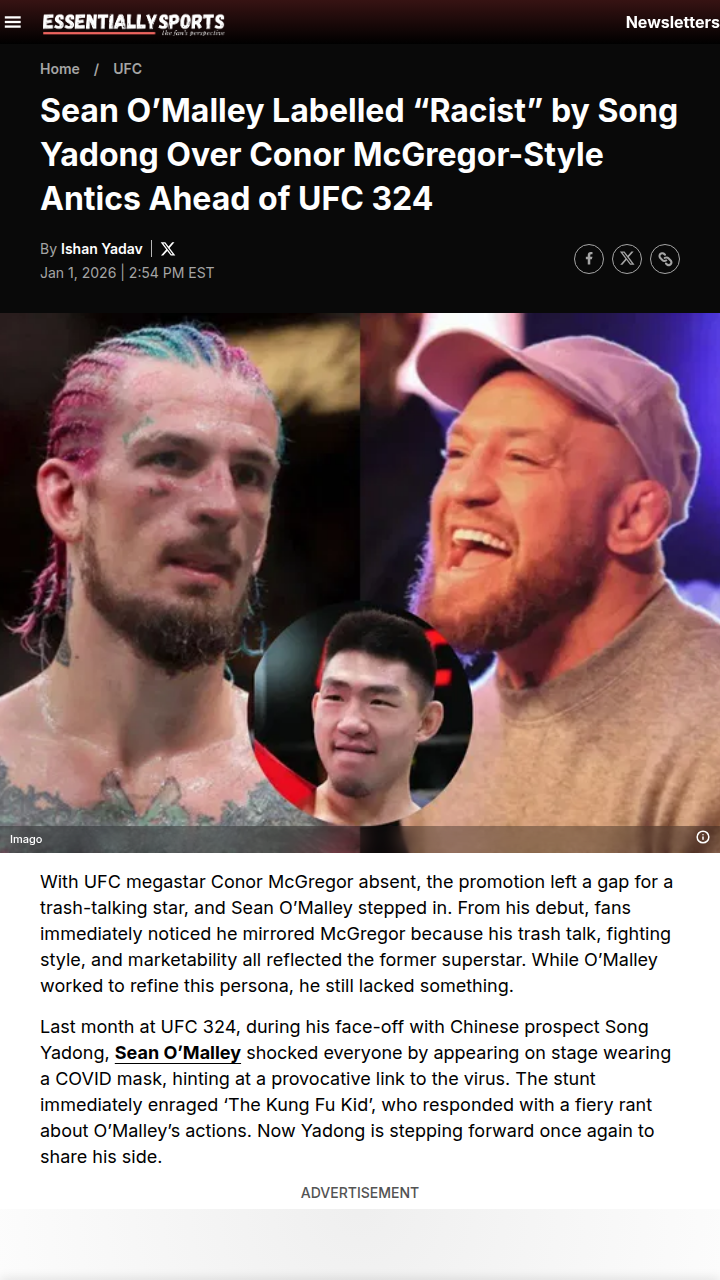 Cathy Sullivan+FollowO’Malley’s McGregor Act Sparks UFC 324 FireUFC fans, what do you make of ‘Suga’ Sean O’Malley channeling his inner Notorious with that controversial COVID mask stunt at the UFC 324 face-off? Song “The Kung Fu Kid” Yadong called it straight-up racist, but also shrugged off the mind games, saying it’s just promo. With O’Malley coming off back-to-back losses and Song leveling up his wrestling, this rivalry’s heating up. Can Song’s new ground game shut down Suga’s comeback? Let’s hear your predictions! #Sports #Wrestling #UFC32400Share