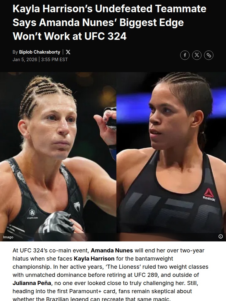 Stacie Lee+FollowWill The Lioness’ Power Roar Again?All eyes are on UFC 324’s co-main event as ‘The Lioness’ Amanda Nunes returns from retirement to challenge Kayla Harrison for the bantamweight crown. But here’s the twist: Harrison’s undefeated teammate, Michelle Montague, claims Nunes’ legendary knockout power won’t be enough this time. With both fighters prepping harder than ever—Nunes even bringing in Harrison’s old rival for camp—this could be a legacy-defining clash. Can Nunes reclaim her throne, or will Harrison’s chin and skill keep her on top? Let’s hear your predictions! #Sports #Wrestling #UFC32410Share