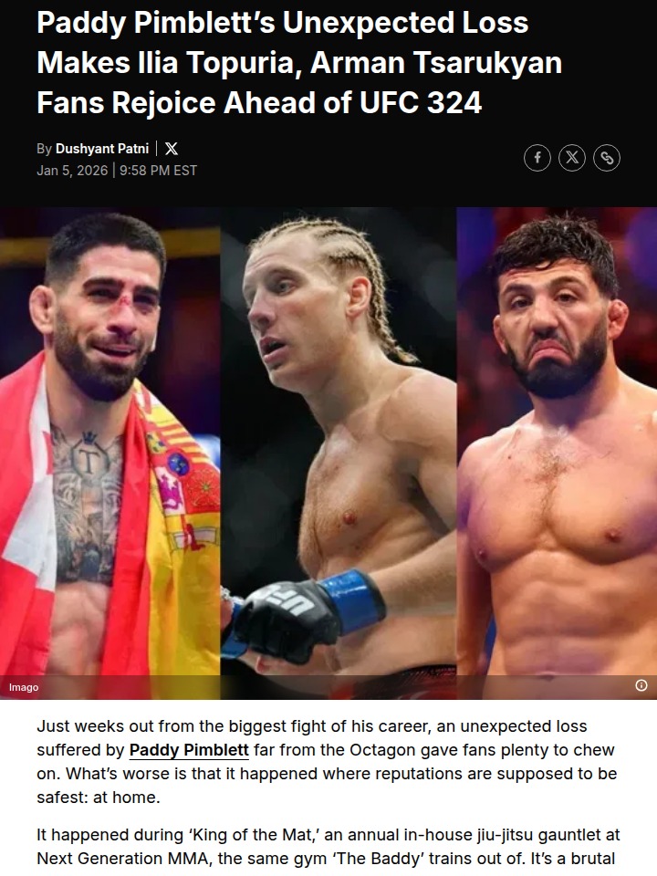 Cathy Sullivan+FollowPaddy ‘The Baddy’ Taps Out—What Now?Big shock from Next Gen MMA: Paddy ‘The Baddy’ Pimblett’s iron grip on the ‘King of the Mat’ gauntlet is over after a surprise tap to Aaron Jordan. With UFC 324 vs. Gaethje looming, fans of Arman Tsarukyan and Ilia Topuria are loving it, calling it proof that Paddy’s grappling isn’t invincible. But let’s be real—gym wars aren’t the Octagon. Does this change your pick for UFC 324? #Sports #Wrestling #UFC32400Share