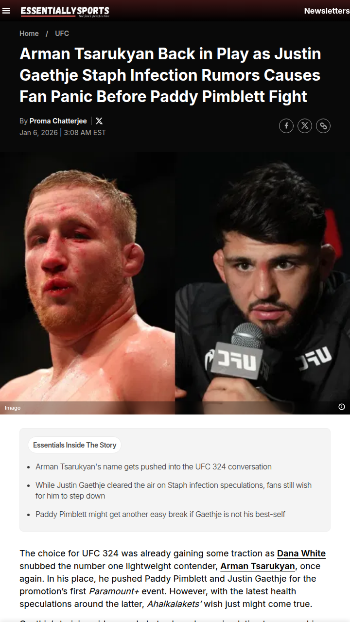 Betty Whitaker+FollowDid The UFC Do Arman Dirty Again?Once again, the UFC’s lightweight division is stirring up controversy. With Ilia Topuria out, fans expected Arman Tsarukyan—arguably the most complete 155er—to get his shot. Instead, Paddy “The Baddy” Pimblett and Justin “The Highlight” Gaethje are fighting for interim gold at UFC 324. Even Jon Anik says Arman’s been treated unfairly, but Dana White insists Tsarukyan still has work to do after the UFC 311 drama. Was this the right call, or is Arman getting snubbed? Sound off below! #Sports #Wrestling #UFC32400Share