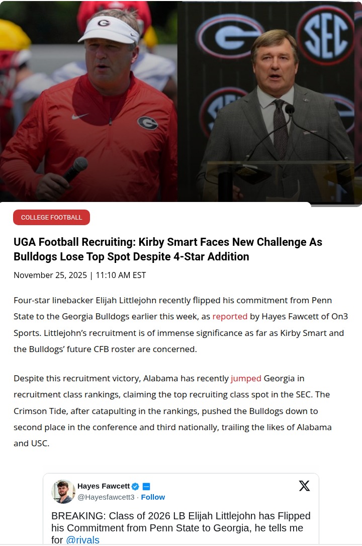 John Camacho+FollowKirby Smart’s Dawgs Slip Behind BamaBig news out of Athens: Kirby Smart just landed 4-star LB Elijah Littlejohn, flipping him from Penn State. But even with this win, the Dawgs lost their SEC recruiting crown to Saban’s Crimson Tide, who surged to No. 1. The rivalry’s heating up as rumors swirl about 5-star QB Jared Curtis possibly flipping to Vandy. Kirby’s tough-love culture is under the microscope—will it keep Georgia elite, or cost them more top talent? #Sports #Football #UGA00Share