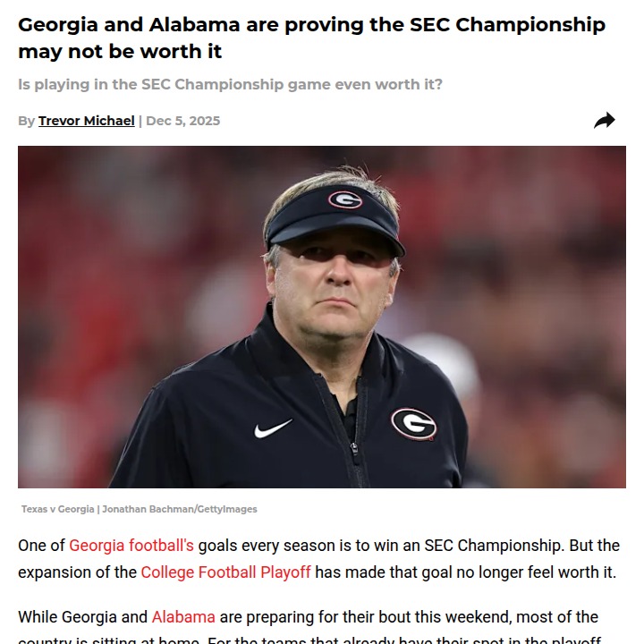 Michael Pitts+FollowIs the SEC Title Game Hurting UGA & Bama?Dawg Nation and Tide fans, is chasing the SEC crown still worth it? With the expanded College Football Playoff, both Georgia and Bama are risking even more injuries while teams like Oklahoma and Ole Miss rest up. The Dawgs are already down seven key players, and the Tide aren’t much healthier. King Kirby says the SEC title still matters, but with the ultimate goal being a Natty, is this showdown just making the road tougher? #Sports #Football #UGA00Share