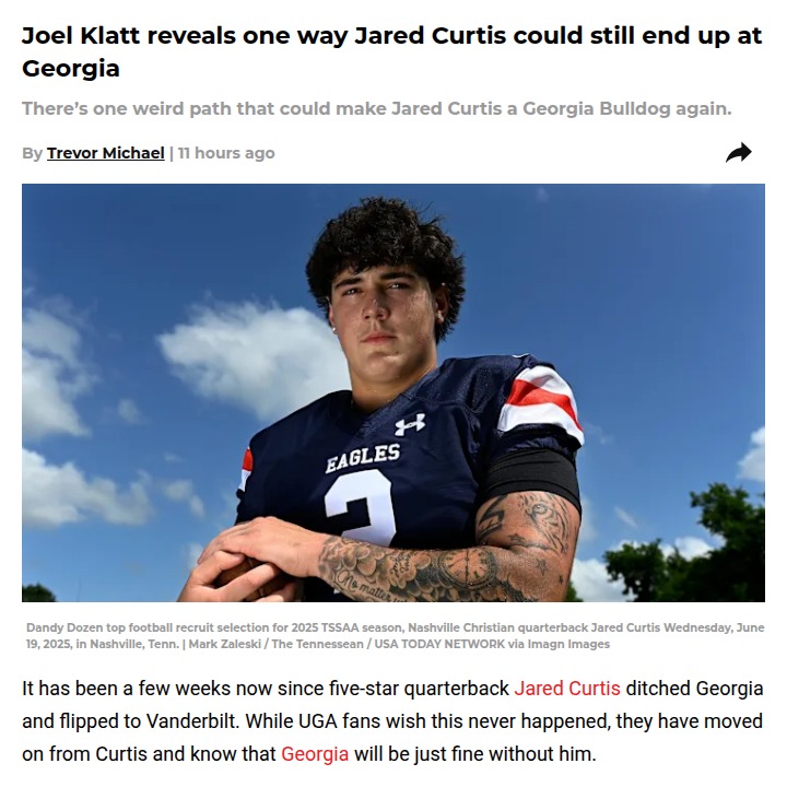 Aaron Taylor+FollowCould Jared Curtis Still Be a Dawg?UGA fans, remember when five-star QB Jared Curtis flipped to Vandy? Most of us have moved on, but Fox’s Joel Klatt just dropped a wild scenario: if Clark Lea leaves Vandy for Michigan, Curtis might want out and could come crawling back to the Dawgs. Would Kirby even take him back after that signing day drama? Either way, next season’s Georgia-Vandy matchup just got a lot more interesting! #Sports #Football #UGA00Share