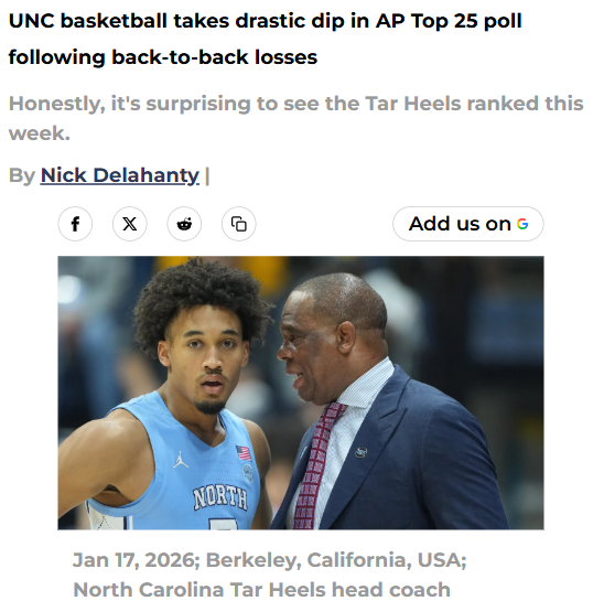 AmberAbyss+FollowUNC’s AP Top 25 slide: What’s next for the Heels?UNC basketball just took a big tumble in the AP Top 25, dropping from No. 14 to No. 22 after back-to-back losses. It’s a wake-up call for the Tar Heels, who now trail Duke, Virginia, and Clemson in the ACC rankings. With tough games ahead—including two showdowns with Duke—UNC’s season could go either way. Do you think the Heels can bounce back and prove they belong among the nation’s best, or is this a sign of deeper issues? Let’s hear your take on what needs to change! #Sports #UNC #TarHeels00Share