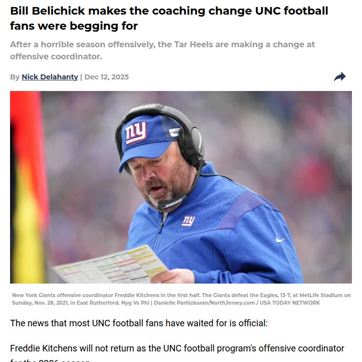 glen25+FollowUNC football shakes up offense after rough seasonUNC football fans finally got the change they’ve been demanding: Freddie Kitchens is out as offensive coordinator for 2026. After a season where the Tar Heels’ offense struggled to put points on the board—ranking near the bottom nationally—Bill Belichick and the new staff decided it was time for a fresh start. While Kitchens wasn’t the only problem, the play-calling and lack of adaptability left many frustrated. Now, with a new coordinator on the way, everyone’s wondering: will this be the move that gets Carolina’s offense back on track? What do you think the team needs most right now? #Sports #Football #UNCFootball00Share