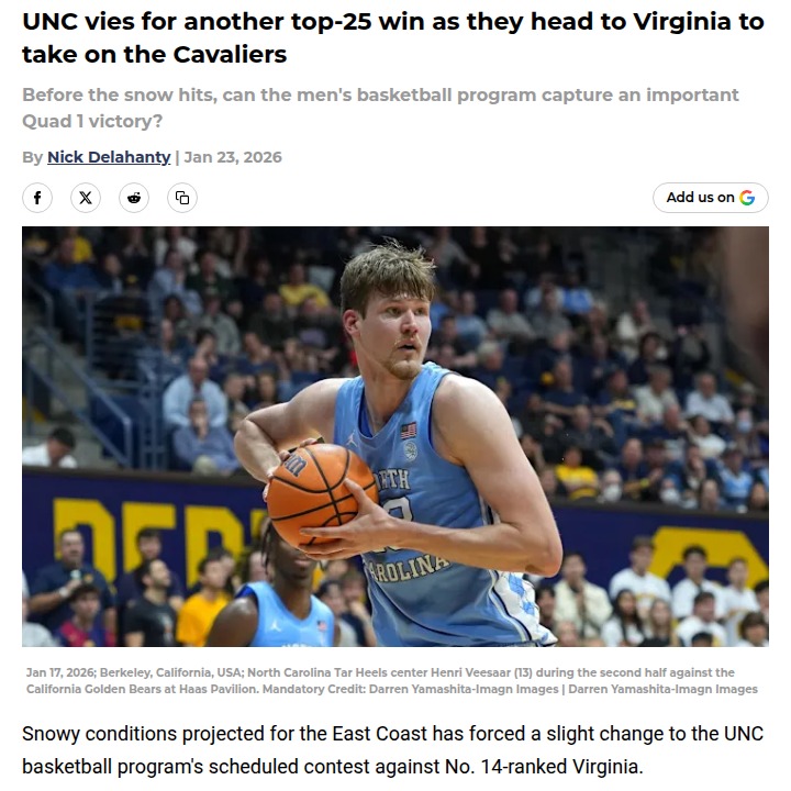 Susan Reeves+FollowUNC vs Virginia: Snow, stakes, and a must-winGame time’s been bumped up to noon as snow heads for Virginia, but the real storm is on the court. UNC faces a red-hot, top-25 Cavaliers squad that’s undefeated at home and deadly from three. For the Tar Heels, defending the arc and hitting free throws are non-negotiable if they want to pull off the upset. With lineup changes and postseason hopes on the line, this one could define UNC’s season. What’s your take—can the Heels break through in Charlottesville, or will Virginia’s home streak roll on? #Sports #Basketball #UNCvsVirginia00Share