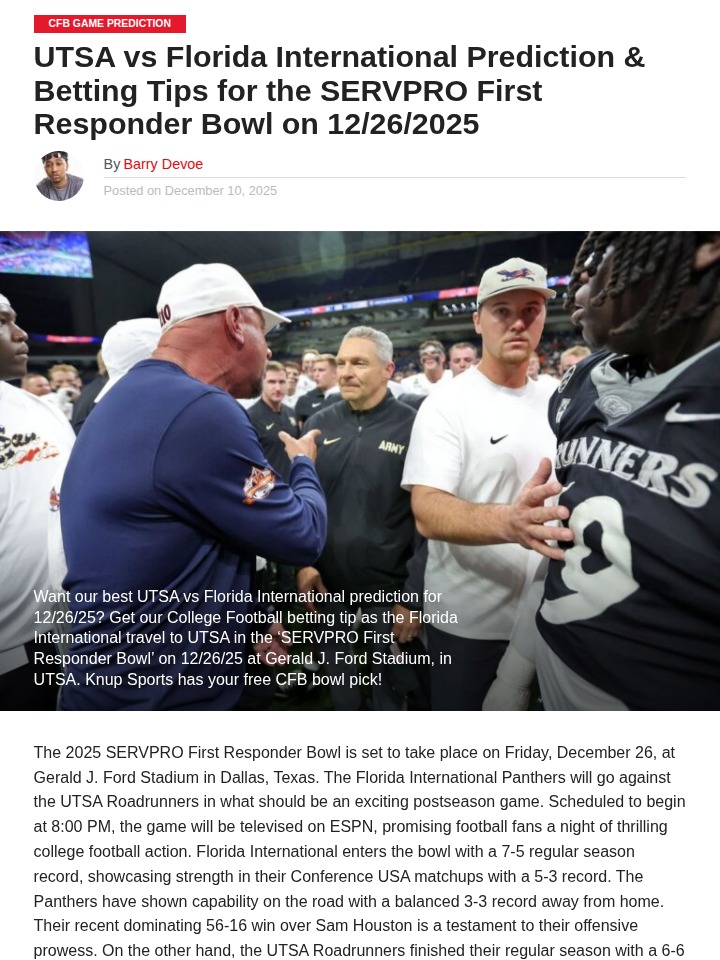 glen25+FollowRoadrunners vs Panthers: Bowl Showdown Heats UpAll eyes are on the SERVPRO First Responder Bowl as the UTSA Roadrunners take on the FIU Panthers in Dallas. This matchup is all about offensive fireworks—Owen McCown’s precision for UTSA versus Kejon Owens’ ground dominance for FIU. Both teams have leaky defenses, so expect a high-scoring affair. Will the Roadrunners’ bowl experience give them the edge, or can the Panthers extend their hot streak? Let’s hear your predictions! #Sports #Football #UTSA00Share