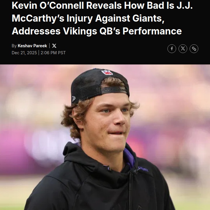 Jeffrey Armstrong+FollowVikings vs Giants: J.J. McCarthy ScareSkol Nation, that Vikings vs Giants clash was a nail-biter, but the big story is J.J. McCarthy’s injury. The rookie QB went down with a right hand issue, and fans held their breath as Max Brosmer took over. Coach O’Connell didn’t have answers right away, but X-rays came back negative—huge sigh of relief! Still, more tests are coming. How do you feel about Brosmer’s performance stepping in? Let’s talk QB depth and playoff hopes! #Sports #Football #Vikings00Share