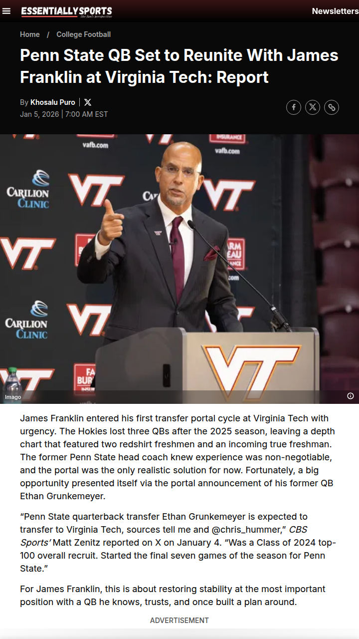 Amy Williams+FollowFranklin’s QB Move: Grunkemeyer to HokiesBig news in the college football world: Ethan Grunkemeyer, the former Nittany Lion backup, is reuniting with Coach Franklin at Virginia Tech. Fans are split—some say Franklin’s track record with QBs is shaky, while others believe Grunk can finally shine as a pocket passer for the Hokies. Is this the move that finally stabilizes VT’s offense, or another QB lost in the shuffle? #Sports #Football #VirginiaTech00Share