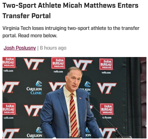 EchoingEagle+FollowVirginia Tech’s two-sport standout hits the portalMicah Matthews, one of Virginia Tech’s most promising two-sport athletes, is leaving the Hokies before making his mark in either baseball or football. Matthews, a top-100 baseball recruit and four-star football prospect from Bridgewater, was expected to add serious depth to both squads this year. His decision to enter the transfer portal is a big blow, especially for the baseball team, which was counting on his talent for the upcoming season. Balancing two sports at the college level is no joke—what do you think this means for the future of dual-sport athletes at Tech? #Sports #VirginiaTech #TransferPortal00Share
