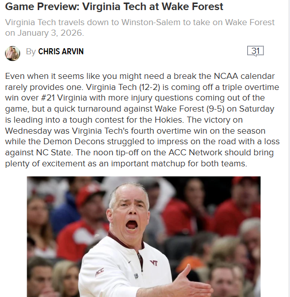 AmberAbyss+FollowVirginia Tech vs Wake Forest: Who’s got the edge?Ben Hammond just dropped 30 points to help Virginia Tech take down Virginia in overtime, and now the Hokies are rolling into Winston-Salem to face Wake Forest. Both teams are tough when they control turnovers, but Virginia Tech’s shooting has been on fire lately. Wake Forest is strong at home and loves the three-ball, but can they slow down the Hokies’ momentum? With both squads nearly even in stats, this ACC matchup feels like it could go either way. Who do you think will come out on top? Let’s hear your predictions! #Sports #CollegeBasketball #VirginiaTech00Share