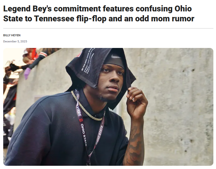 EchoingEagle+FollowLegend Bey’s Wild Vols-Bucks Flip: What’s Up?Legend Bey’s recruitment saga is turning into a real soap opera for Vols and Buckeyes fans. The 4-star QB from Texas first pledged to Tennessee, then flipped to Ohio State, only to sign back with the Vols—allegedly because his mom preferred Rocky Top. Rumors are swirling after a quickly deleted tweet and mixed signals to reporters. With all this drama, do the Vols really have their guy? Or could the Buckeyes still swoop in? #Sports #LegendBey #Vols00Share