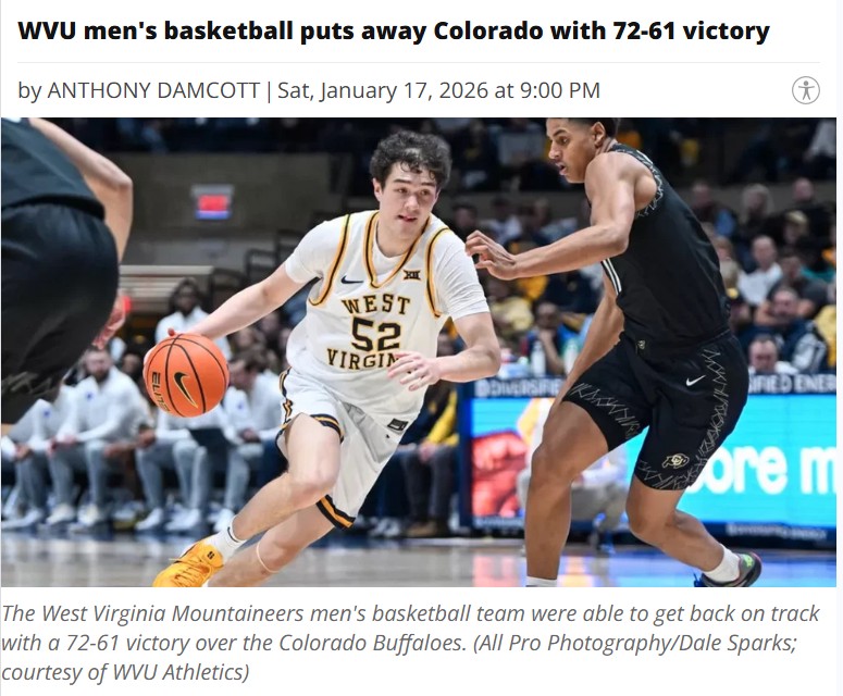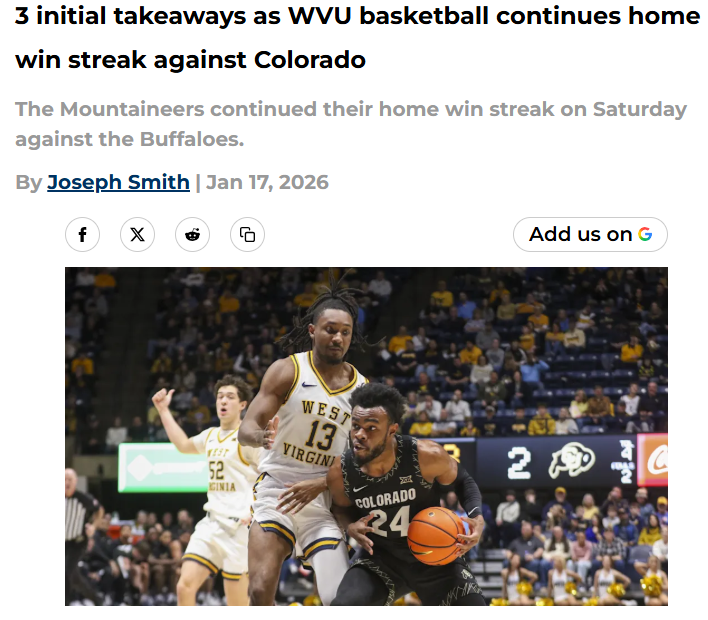 CrimsonChameleon+FollowMountaineers’ home streak keeps Morgantown buzzingWVU basketball just made it 15 straight home wins at the newly named Hope Coliseum, showing Morgantown really is a fortress for the Mountaineers. Saturday’s 72-61 win over Colorado wasn’t just another notch in the belt—it was a statement. Treysen Eaglestaff’s 22-point night gave the team a spark, but what really stood out was how WVU bounced back after nearly letting the lead slip. That kind of resilience is what fans have been waiting for. How much does this home energy matter for the rest of the season? Let’s hear your thoughts! #Sports #WVU #Mountaineers00Share