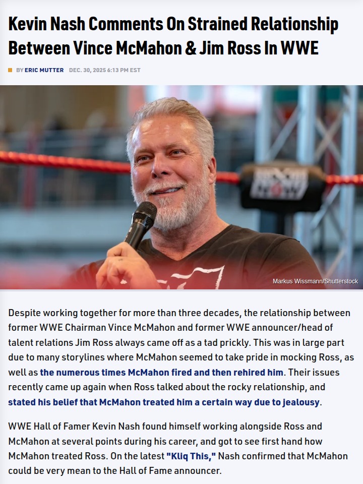 Stacie Lee+FollowNash Spills on Vince & JR’s WWE TensionBig Daddy Cool just dropped some real talk on the old Vince McMahon vs. Good Ol’ JR saga. Kevin Nash confirmed what many fans suspected: The Boss was pretty ruthless with Ross, especially during JR’s Bell’s Palsy struggles. Nash says Vince was tough on a lot of folks, but JR got it the worst. Do you think Vince’s treatment of JR was about jealousy, or just classic McMahon power plays? #Sports #Wrestling #WWE00Share