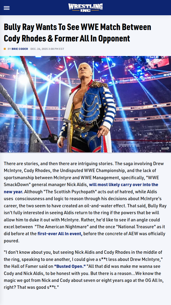 dbrown+FollowCody vs Aldis: Run It Back in WWE?Anyone else getting chills thinking about a possible rematch between The American Nightmare and the National Treasure? Bully Ray just said he’d rather see Cody Rhodes and Nick Aldis go at it again than watch Drew McIntyre feud with management. Their All In 2018 clash was legendary—Cody ended Aldis’ 266-day NWA reign, and Aldis got his revenge a month later. Could WWE recapture that magic? I’m all in if Cody’s still champ! #Sports #Wrestling #WWE40Share