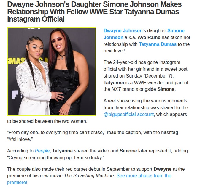 Stacie Lee+FollowAva Raine & Tatyanna Dumas Go Public!Big news from the NXT universe—Ava Raine (Simone Johnson, The Rock’s daughter) and Tatyanna Dumas just made their relationship Instagram official! Fans have been speculating for months, but now it’s confirmed with a heartfelt reel and sweet captions. The duo even hit the red carpet together at The Smashing Machine premiere. How do you think this power couple will impact the NXT locker room dynamic? #Sports #Wrestling #WWENXT00Share