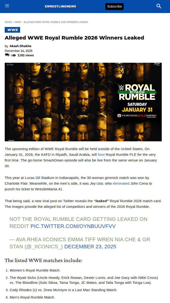Melissa Wyatt+FollowRoyal Rumble in Riyadh: No Delay Drama!Hey WWE Universe! Despite the buzz about the new Riyadh stadium not being ready, reliable sources have crushed the rumors—2026’s Royal Rumble is still set for January 31. The venue’s almost done, and the hype is real: over 750,000 fans tried for tickets! Can you imagine the pop when The Tribal Chief or The Man enters the first-ever Rumble outside North America? This is history in the making, folks! #Sports #Wrestling #WWERoyalRumble00Share