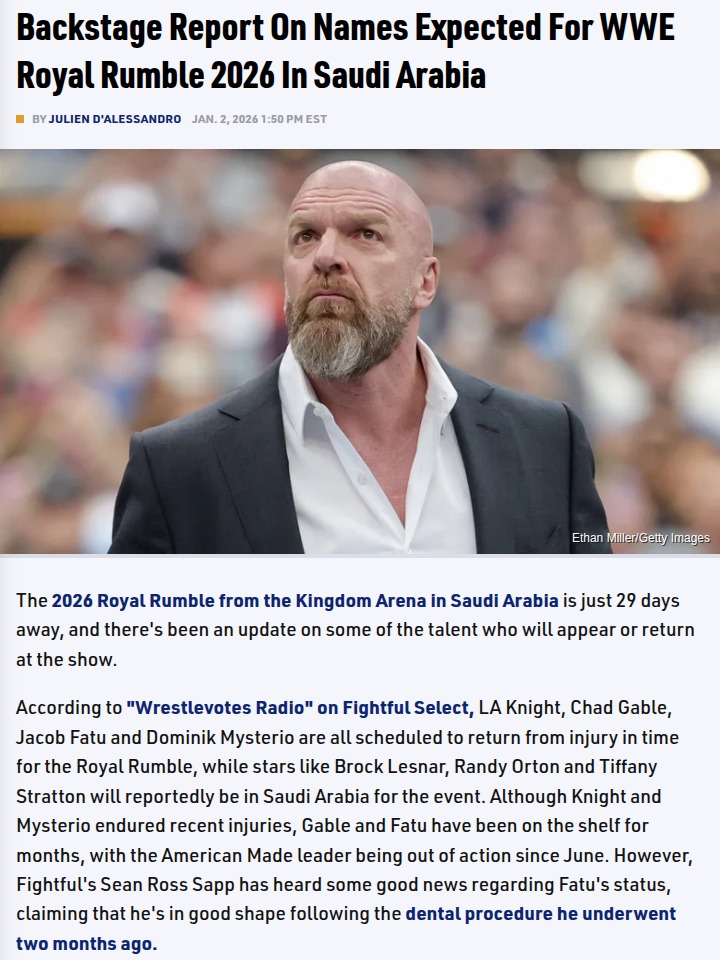 Stephanie Bailey+FollowRoyal Rumble 2026: Big Returns in Saudi ArabiaWith the 2026 Royal Rumble just a month away, the rumor mill is heating up! Word is, LA Knight and Dirty Dom are making their comebacks from injury, and we might finally see Jacob Fatu and Chad Gable back in action. Plus, legends like The Beast (Lesnar) and The Viper (Orton) are set to be in the Kingdom Arena. Which return are you most hyped for, and how do you think these shakeups will impact the Rumble? #Sports #Wrestling #WWERoyalRumble30Share