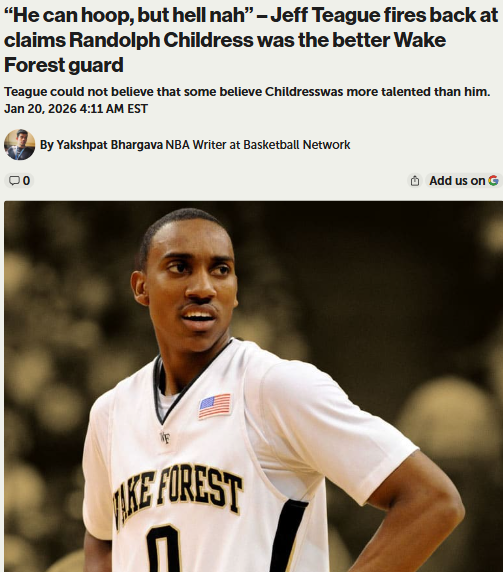 Theresa Boyd+FollowWake Forest hoops debate heats upJeff Teague isn’t holding back when it comes to ranking Wake Forest’s greatest guards. He’s cool with legends like Tim Duncan, Chris Paul, and Muggsy Bogues being ahead of him, but he’s drawing the line at Randolph Childress. Teague’s take? Childress may have been a college star, but his brief NBA run doesn’t stack up to Teague’s All-Star nod and championship ring. Still, Childress’ college stats and legacy at Wake make this a real debate for fans. Who do you think deserves the higher spot in Wake Forest history? #Sports #Basketball #WakeForest00Share
