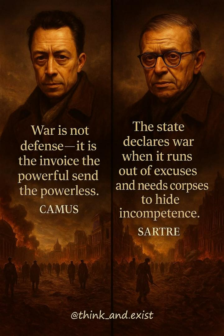 The Savaged Unfiltered Show+FollowWar is the invoice sent to those who never signed the contract Camus reveals war as a transaction — the powerless pay the price while the powerful write the bill. Sartre reminds us that war isn’t strategy — it’s the last excuse of a state that has failed and needs bodies to bury its mistakes. #fblifestyle #camus #sartre #war #truth #power #philosophy #politics #deepthoughts10Share