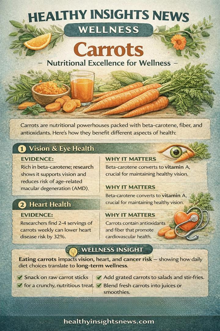Did you know that just 2-4 servings of carrots weekly can lower heart disease risk by a whopping 32%? Plus, they're crucial for maintaining healthy vision by converting beta-carotene into Vitamin A, and even play a role in impacting cancer risk!
