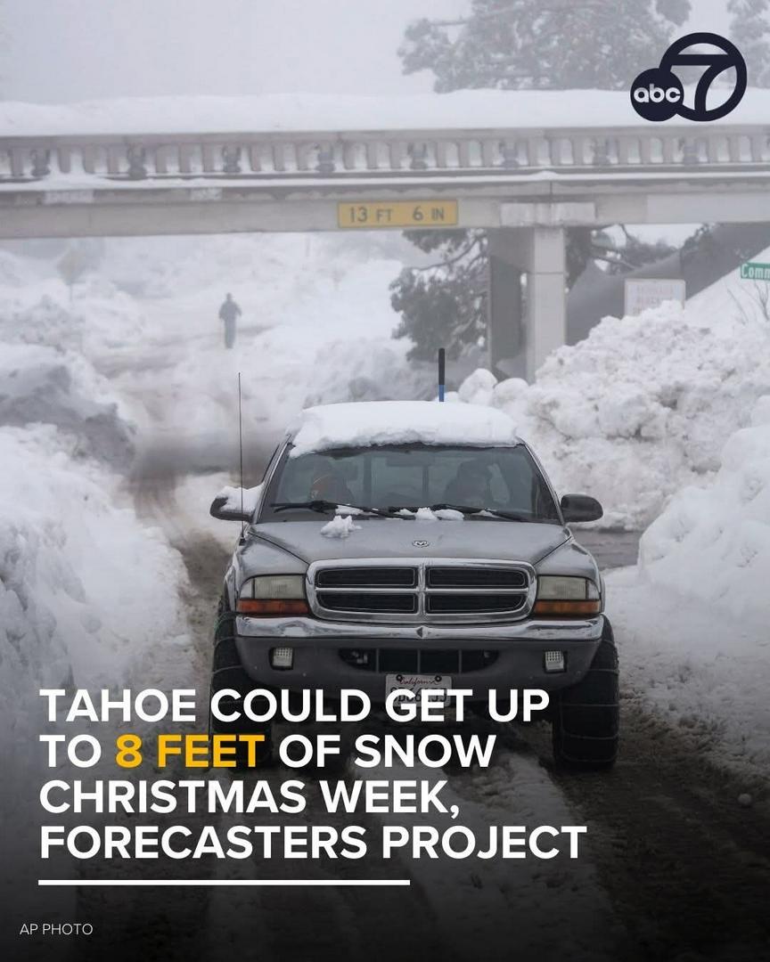 Kristy Tallman+FollowCALIFORNIA 🎄❄️ MAJOR SIERRA SNOWSTORM TO HIT CHRISTMAS EVE & DAY A Winter Storm Warning begins Tuesday night, with heavy Sierra snow creating major travel impacts through Christmas night. Snow ramps up Christmas Eve morning and doesn’t let up. Tahoe resorts above 6,500’ could see an incredible 4–8 FEET of new snow. Holiday travel will be rough. Powder lovers will be thrilled. Plan ahead, carry chains, and don’t underestimate this one. #SierraSnow #Tahoe #WinterStorm #ChristmasWeather #TravelAlert130Share