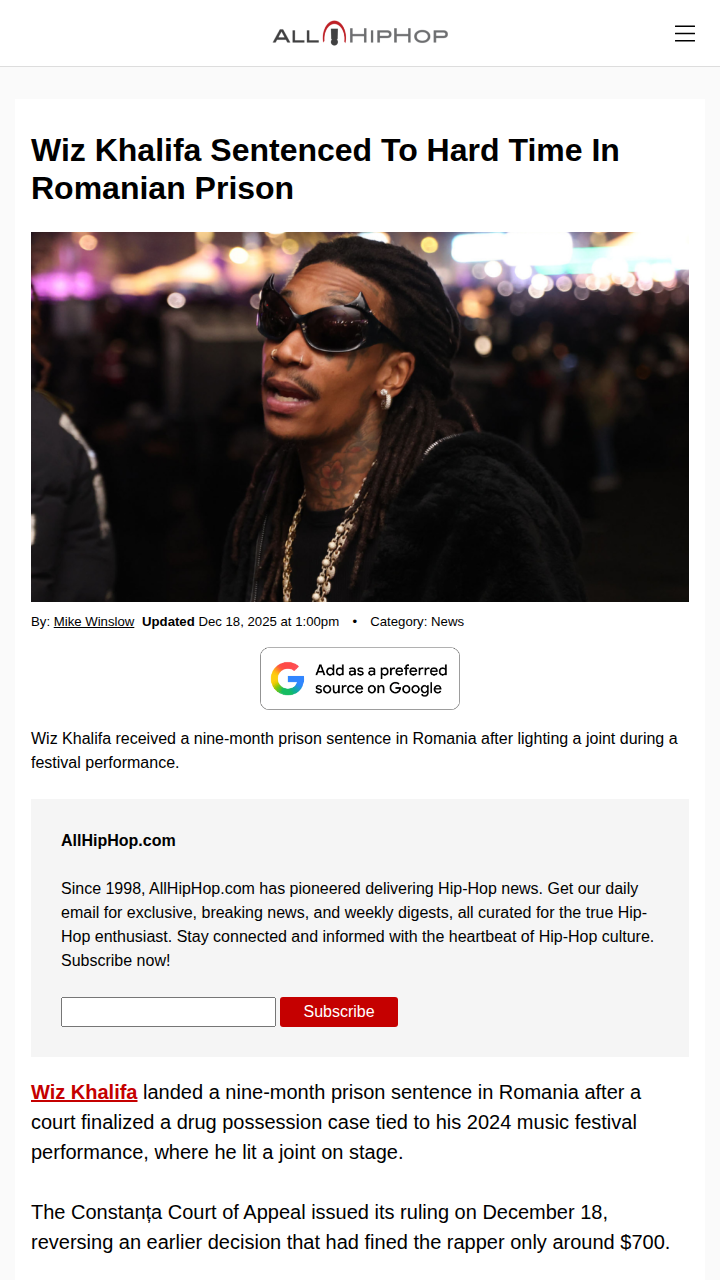 Little Miss Block The Haters+FollowWiz Khalifa has been sentenced to nine months in prison by a Romanian court following a July 2024 performance at the Beach, Please! Festival, where authorities say he smoked cannabis onstage and was later found with more than 18 grams of marijuana. While an earlier ruling resulted in only a fine, prosecutors appealed, leading to the tougher sentence from the Constanța Court of Appeal. Cannabis possession remains illegal in Romania and can carry prison time. Wiz Khalifa is not currently in custody, and it’s unclear whether Romania will pursue extradition. His legal team is reportedly exploring next steps.🛑 #WizKhalifa #MusicNews #InternationalNews #Romania #LegalTroublesAbroad 15954Share