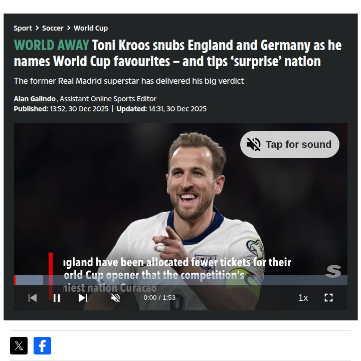 Charles Mills+FollowKroos Snubs England & Germany for WC GloryWow, Toni Kroos just dropped a bombshell on Romario TV! The German maestro left both the Three Lions and Die Mannschaft off his World Cup favorites list, instead backing Spain, Portugal, and France to go all the way. Even more interesting, he’s tipping Morocco as a dark horse after their recent technical leap. Do you agree with Kroos’ picks, or is he sleeping on England’s chances? Let’s hear your thoughts! #Sports #Soccer #WorldCup202600Share