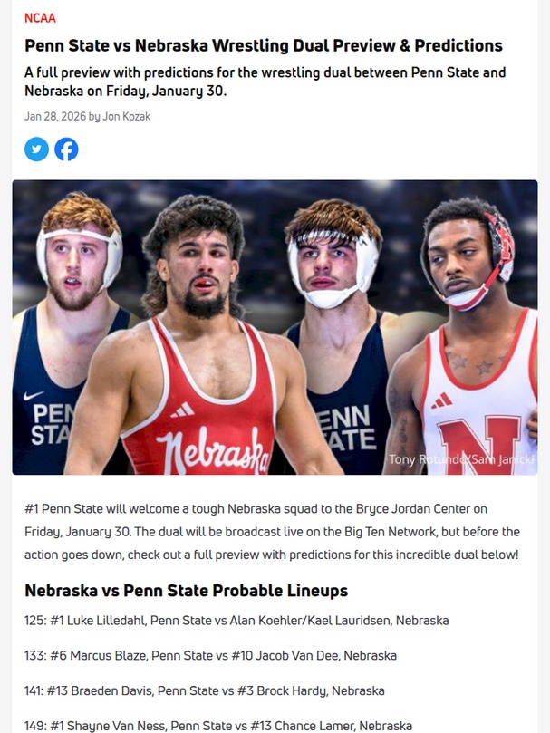 Cathy Sullivan+FollowPenn State vs Nebraska: Wrestling showdown heats upFriday night at the Bryce Jordan Center is shaping up to be a wrestling fan’s dream—Penn State’s powerhouse squad is set to take on a gritty Nebraska team, and nearly every match is a top-10 battle. With Penn State’s lineup stacked with undefeated stars like Luke Lilledahl, Mitchell Mesenbrink, and Levi Haines, Nebraska’s best will have to dig deep for any upsets. The 157-pound clash between PJ Duke and Antrell Taylor could be the highlight, with both wrestlers having something to prove. Who do you think will pull off the biggest surprise? Let’s hear your predictions! #Sports #Wrestling #PennState00Share