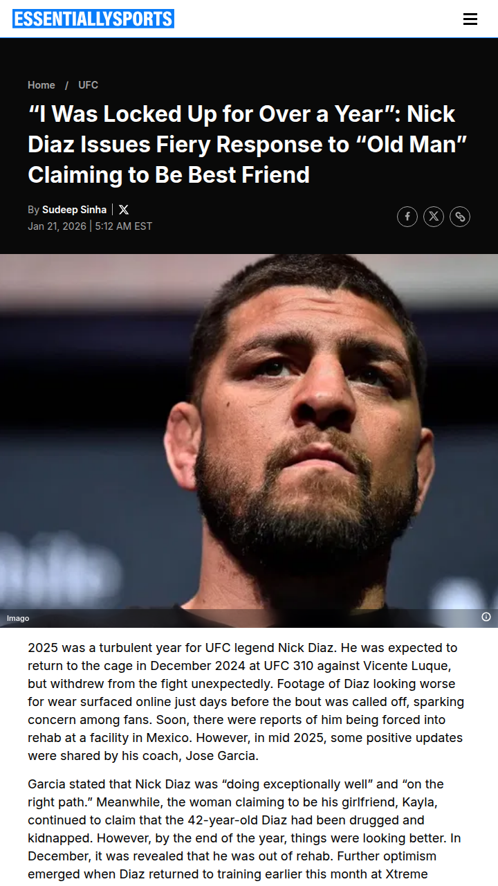 Kendra Ward+FollowStockton Bad Boy Fires Back at 'Old Man'Nick Diaz just dropped a bombshell on IG, calling out the so-called 'old man' (likely Coach Garcia) for controlling his life during his year-long rehab saga. After a wild 2025—rehab rumors, canceled fights, and public drama—Diaz is back training at Xtreme Couture and credits his wife Kayla for real support. He even had words for Nate and YouTubers stirring the pot. What do you make of this Diaz family feud? #Sports #Wrestling #NickDiaz00Share